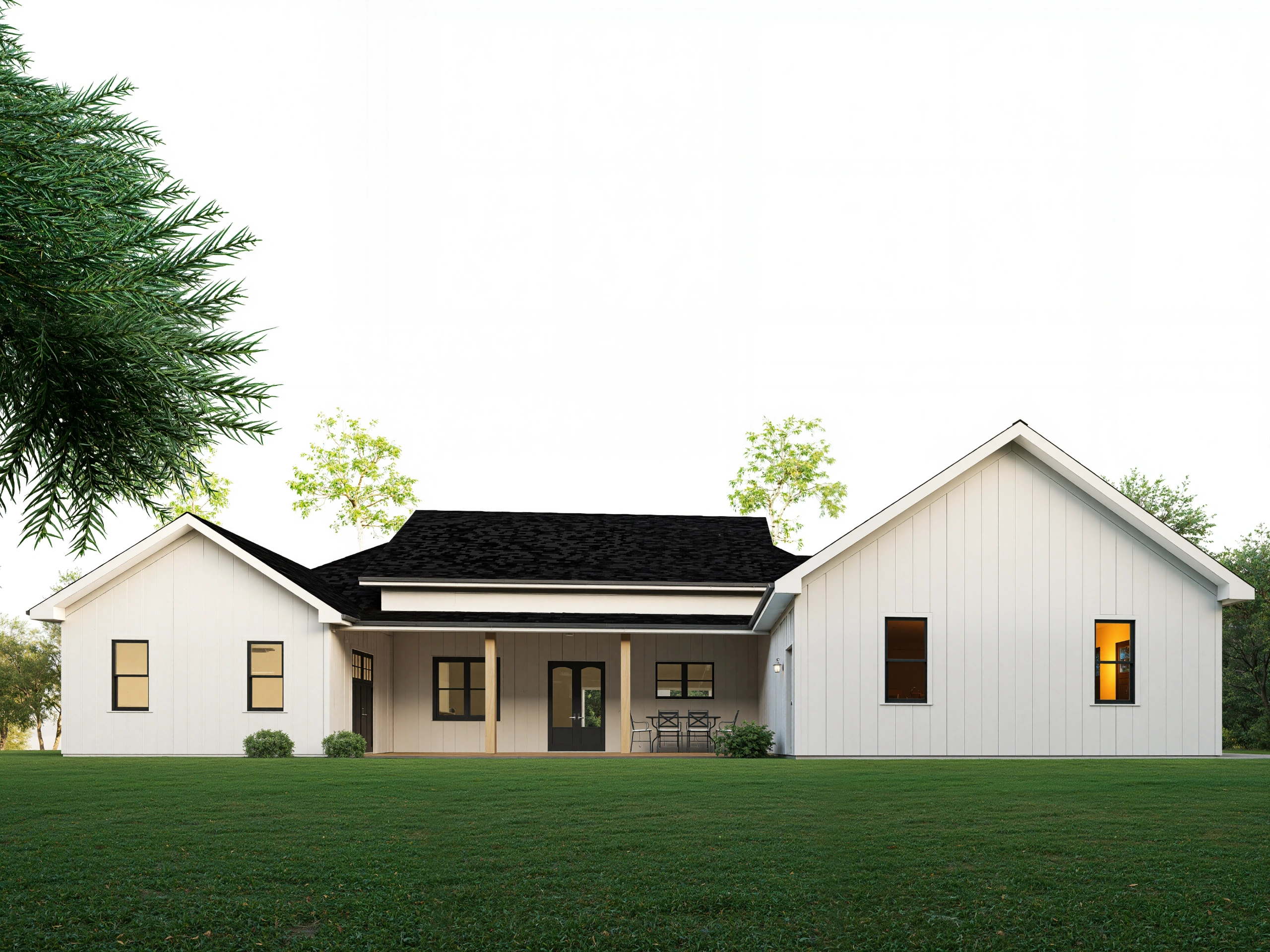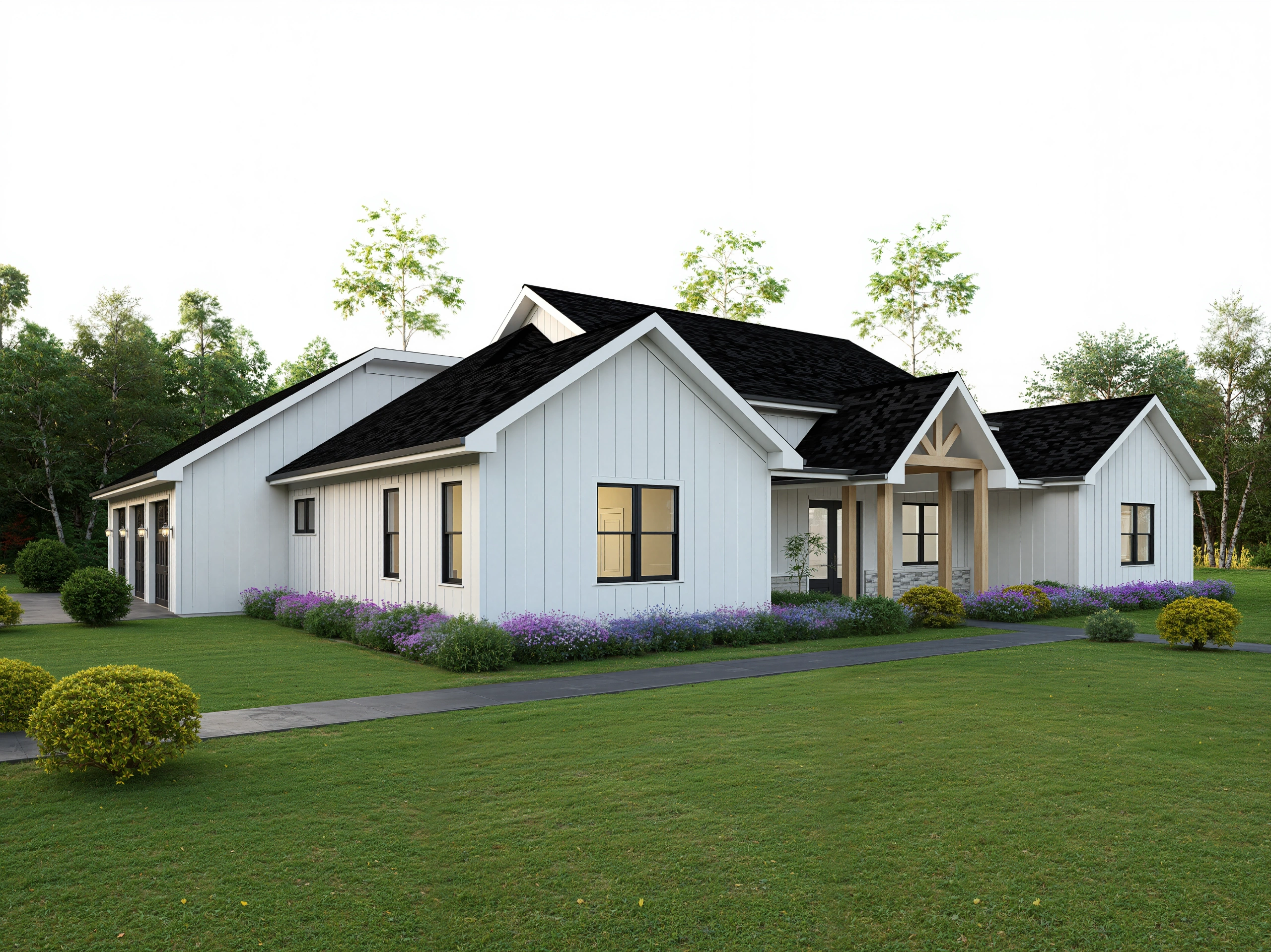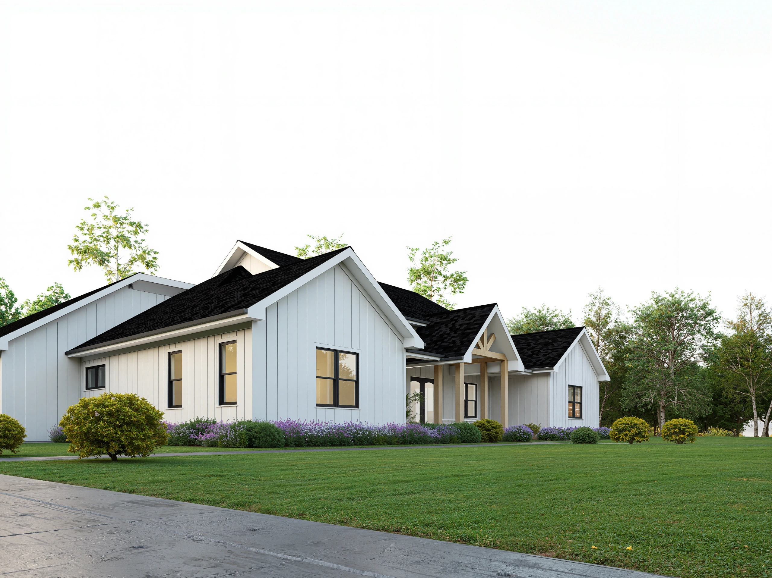 The Autumn Bend offers the perfect balance of sprawling ranch-style living and modern architectural flair. With a generous 2,390 square feet of living space, this home is designed for larger families who need room to breathe without the hassle of stairs. The exterior combines crisp vertical siding with warm timber accents and a welcoming front porch, creating an inviting façade that feels right at home in both suburban and rural settings.