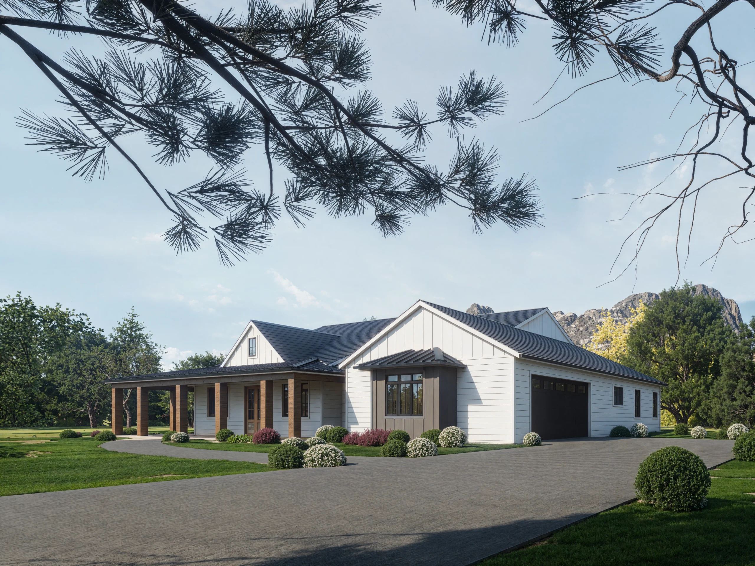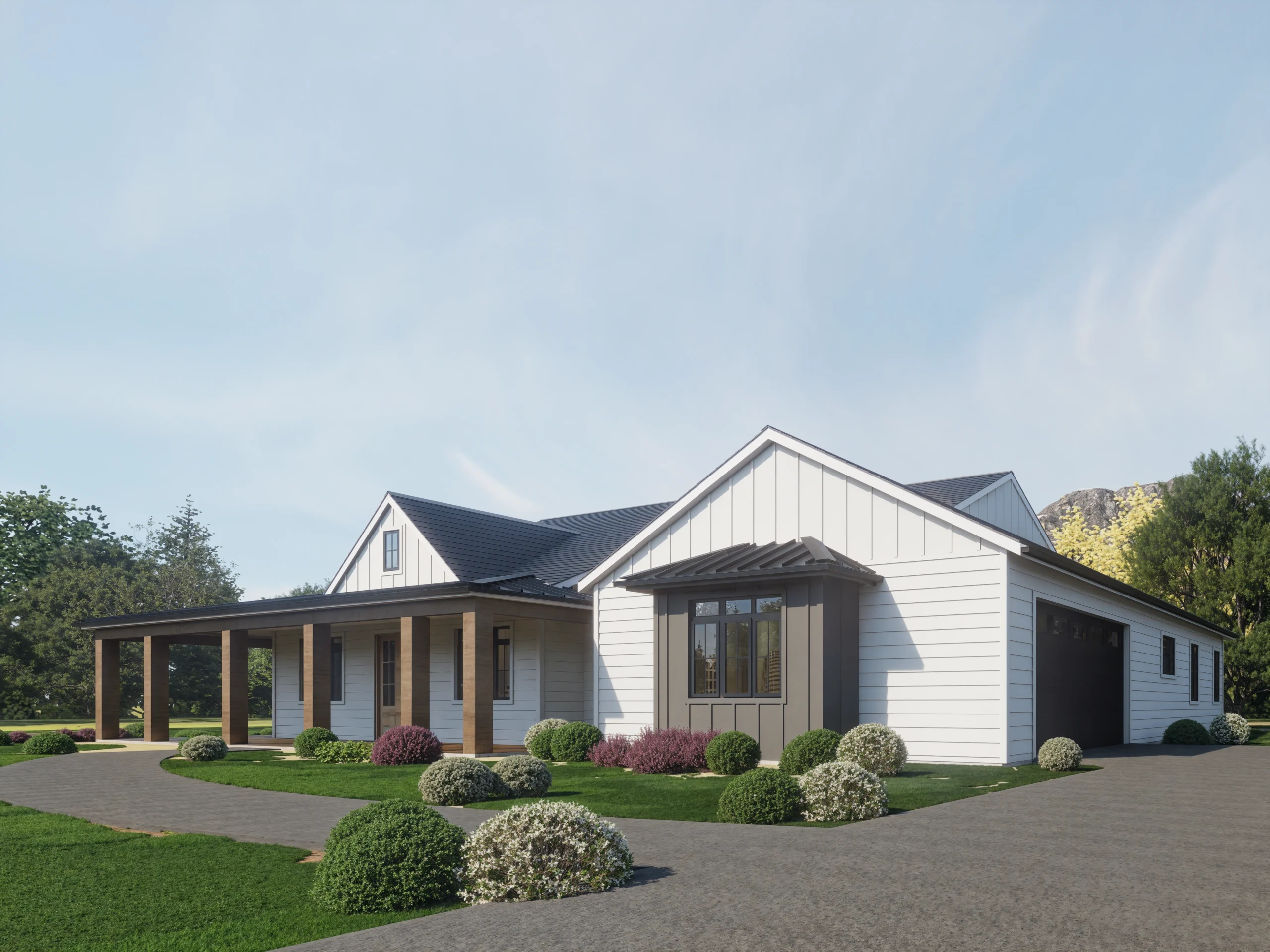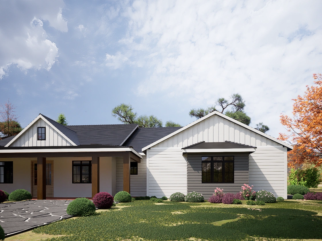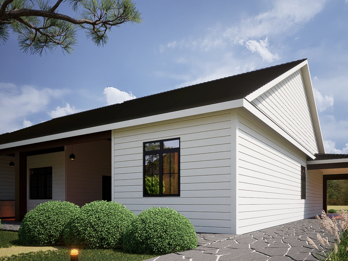 The Quartz Square captures the essence of modern country living with its signature Wrap-Around Porch (46′ x 8′), perfect for enjoying views from multiple angles. The exterior blends crisp white horizontal siding with warm wood columns and a dark metal roof accent, creating a timeless curb appeal.