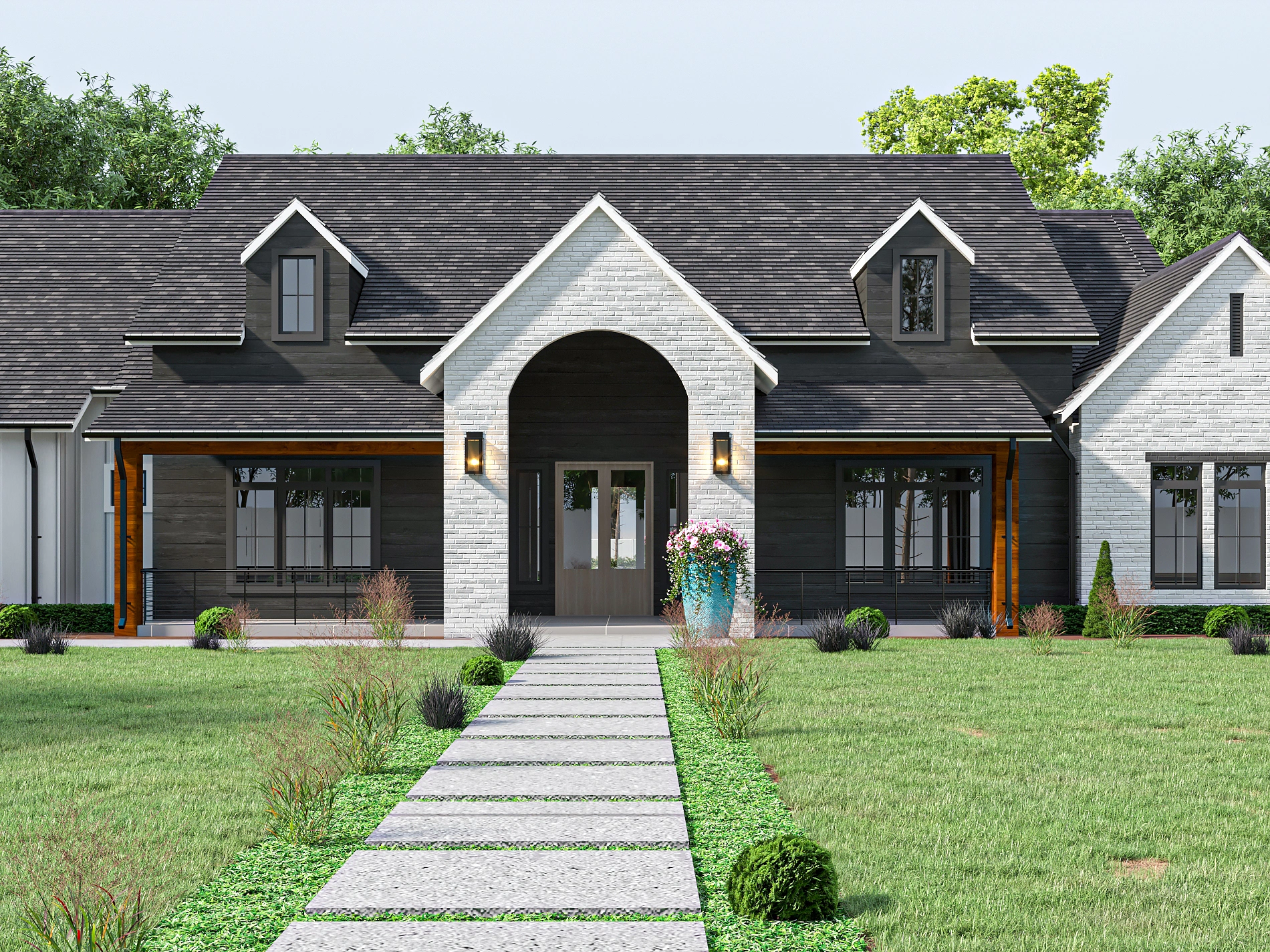 The Summer Falls is a statement home designed for those who refuse to compromise on style or space. Blending the warmth of a Modern Farmhouse with the grandeur of European architecture, the exterior features a stunning brick-and-siding façade, steep 12/12 rooflines, and a dramatic arched brick entryway that immediately sets a tone of luxury.